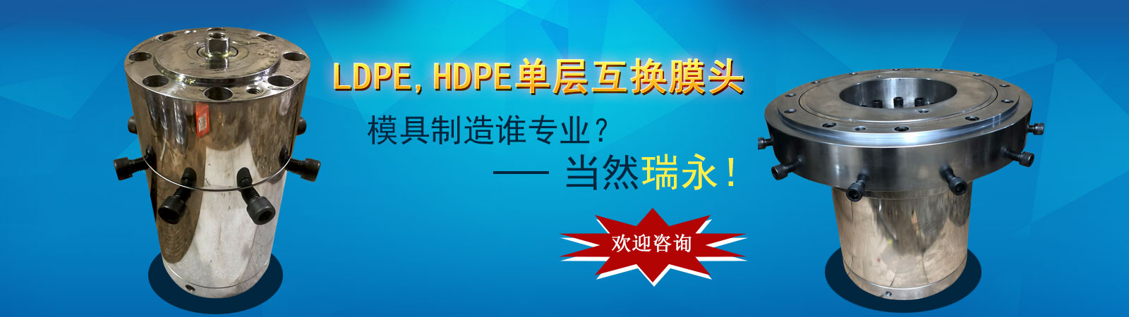瑞安市瑞永模具有限公司是一家科研、制造、銷售、服務(wù)為一體的綜合性企業(yè)。專業(yè)生產(chǎn)各種規(guī)格的吹膜機(jī)膜頭、吹膜機(jī)三通、吹膜機(jī)風(fēng)環(huán)、吹膜機(jī)旋轉(zhuǎn)器、吹膜機(jī)配件等相關(guān)配件的生產(chǎn)廠家;專注吹膜機(jī)模具也有15年歷史。